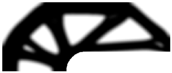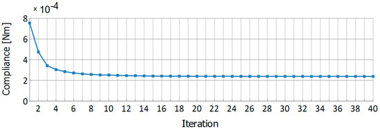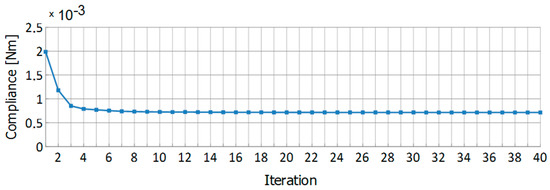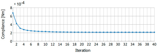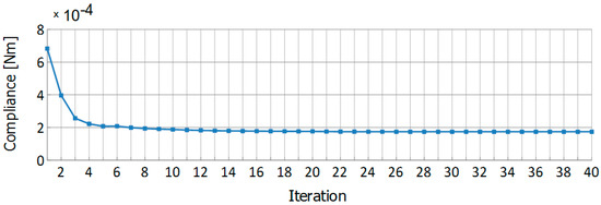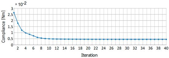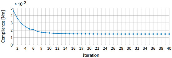 Additionally, the initial irregularities in the mesh were introduced to illustrate the flexibility of the method. Irregularities (a denser mesh) were located in places with the expected concentration of stresses for the initial structure (see Figure 15). The final value of the compliance equaled 2.388 × 10−4 Nm. The iteration history is shown in Figure 16.