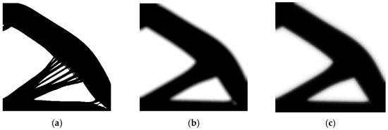 Final topology obtained using [35] with a small (a) and a large filtering radius. Case (b) refers to density filtering, whereas case (c) is the result of application of filtering based on Helmholtz-type differential equations.