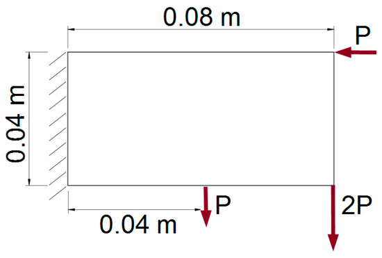 As a second introductory example, a plain elastic structure fixed along the left edge, and loaded with three concentrated forces, as presented in Figure 17, was chosen. The Young modulus and the Poisson ratio were E = 2 × 1011 Pa and ν = 0.3, respectively, and P equaled 1000 N. A volume fraction equal to 0.5 was implemented.