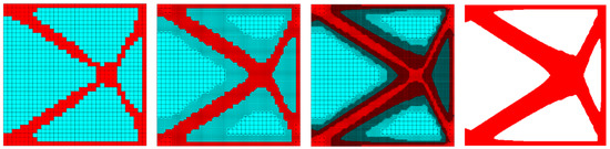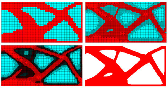 A rectangle (2 m × 1 m) supported at the left and right lower corners under self-weight was investigated to illustrate the topology optimization under the presence of self-weight loading. Half of the element was considered due to the symmetry. The Young modulus E = 2 × 1011 Pa and the Poisson ratio ν = 0.3, were implemented. The density of the material equaled ρ = 8000 kg/m3. The volume fraction was equal to 0.5. Only self-weight loading was taken into account. The initial regular mesh consisted of 400 elements, and at the end of the refinement process this number reached the value of 4593. Selected middle topologies and the final one are presented in Figure 38. The corresponding regular grid would require 32,400 elements.