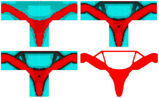 To check if the resulting designs depend on the initial resolution of the mesh, the calculations were repeated for three sizes of initial elements: 0.0025 m2, 0.0004 m2, and 0.0001 m2. Final topologies are presented in Figure 12, including those calculated for a regular mesh for 211,600 elements. In each case, the same number (2) of mesh refinements was performed during the adaptation process, to get a more appropriate comparison.