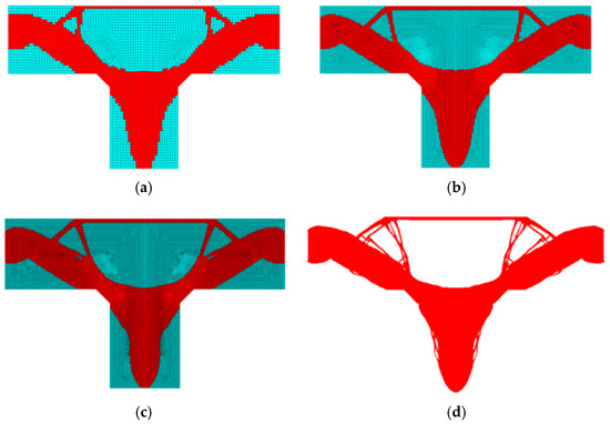 Final topologies obtained for four sizes of initial elements: 0.0025 m2 (a), 0.0004 m2 (b), 0.0001 m2 (c) and ~4.726 × 10−6 m2 regular mesh (d). For the last case the grid has not been shown to improve the clarity of the picture.