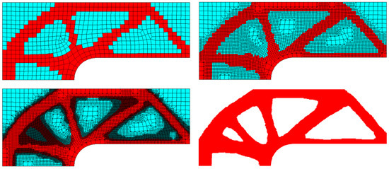 Topology optimization is still one of the most important issues in the field of optimal design of engineering structures. It has gained enormous popularity, for many years being an effective tool applied to innovative design projects with a wide range of applications in various areas, including mechanical engineering, civil engineering, bioengineering, material science, and many others. Today, the interest of researchers and designers is mainly focused on improving the quality, versatility, and effectiveness of optimization algorithms to be applied to solving demanding engineering design tasks. Apart from studies on theoretical issues, e.g., [1,2], new numerical algorithms and methods, e.g., [3], and innovative applications, the attention is focused on computational efficiency and accuracy. Modern fast algorithms are developed with the aim of getting optimization codes, which will guarantee that a relatively small number of iterations is needed. At the same time, the reduction of the dimensionality of problems, combined with the refined mesh adaptation, has been considered. Since the first implementation of adaptive mesh in topology optimization [4], the concept of reduction of the number of design variables has become popular, because it allows creation of similar topologies, compared to those with a large number of design variables involved, without extensive computational effort. Moreover, mesh refinement allows inexpensive but efficient improvement of the finite element solution, as shown in [5,6]. A broad discussion of the current state of knowledge can be found in [7,8,9]. Most published papers focused on adaptive strategies discuss filtering, e.g., [10], errors indicators [11,12], or some aspects of a finite element grid, e.g., [13,14].