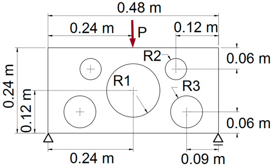 The plane symmetric structure with holes presented in Figure 31 was selected to illustrate the performance of the algorithm for more complicated geometry. The radii of the holes were R1 = 0.075 m, R2 = 0.03 m, R3 = 0.045 m. The Young modulus and the Poisson ratio were E = 2 × 1011 Pa and ν = 0.3, respectively. A volume fraction equal to 0.75 and a concentrated force P = 1000 N were applied.