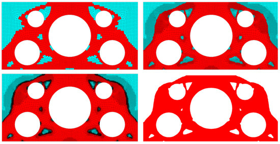 The optimization process started with 645 elements, and at the end the mesh consisted of 18,191 elements. To cover the whole structure with the same very fine mesh, 69,348 elements were required. The final value of a compliance equaled 1.486·10−4 Nm. Selected middle topologies and the final one are presented in Figure 28, the iteration history is presented in Figure 29.