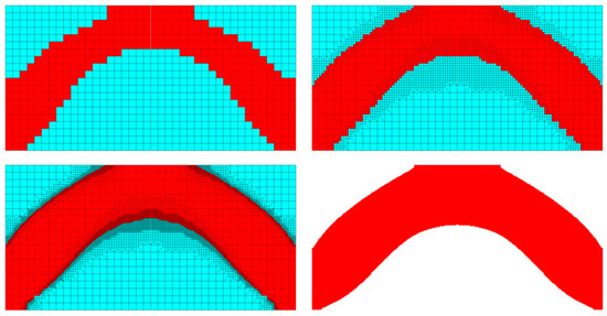 To compare the results of the application of the Cellular Automata to the refined mesh adaptation with the results obtained for a regular mesh, the structure was discretized with a regular lattice of 211,600 elements (~4.726·10−6 m2, see Figure 12d), which corresponds to the size of the smallest elements of the mesh formed during refinement. To get the results for the refined mesh and for the regular mesh, the proposed algorithm needed 39 and 48 iterations, respectively.