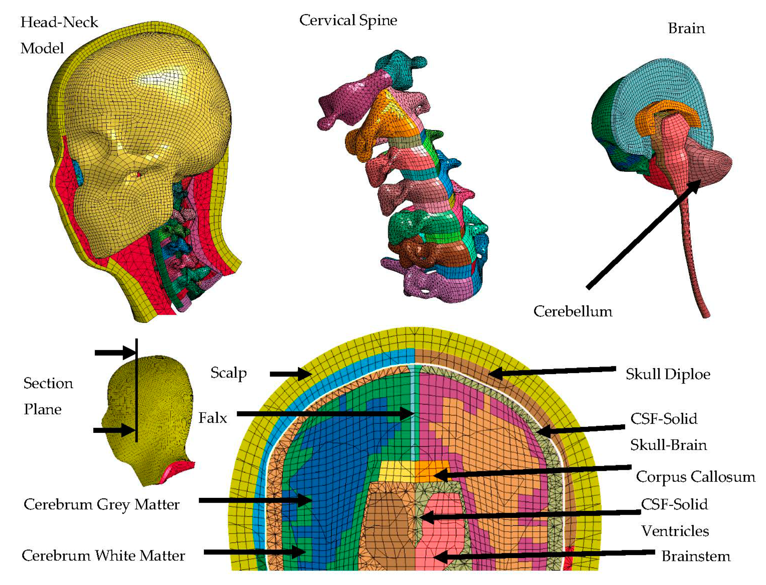 - Brolin, K.; Halldin, P. Development of a Finite Element Model of the Upper Cervical Spine and a Parameter Study of Ligament Characteristics. Spine 2004, 29, 376–385. [Google Scholar] [CrossRef]
