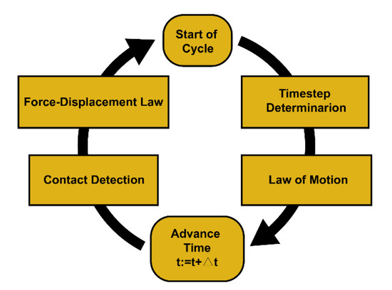 In the current study, a direct shear test was modeled using the commercial code PFC3D produced by Itasca (Minneapolis, USA). PFC3D is based on rigid body and soft contact approaches. In the PFC3D formulation, the spheres are rigid and cannot change their shape and size. The “soft contact” approach assumes that interaction of spheres is represented by assigning each sphere a stiffness and allowing them to overlap. The extent of overlap is used in conjunction with a contact force law to give instantaneous forces from knowledge of the current positions, orientations, velocities, and spins of the particles [30,31]. The calculation cycle of a DEM simulation are schematically represented in Figure 1.