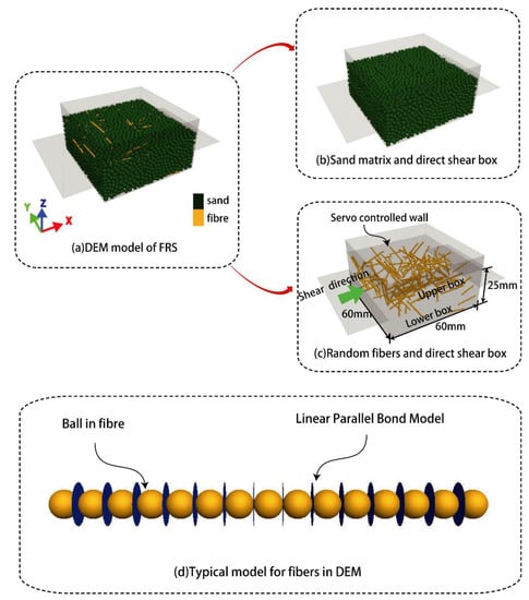 Specimens for three-dimensional DEM simulation: (a) DEM model of FRS, (b) sand matrix and direct shear box, (c) random fibers and direct shear box, and (d) typical modelfor fibers in DEM.