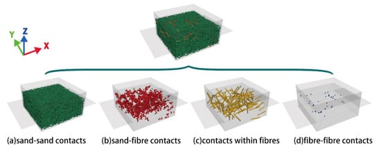 In DEM simulations of granular material, the macroscopic behavior of the whole assembly may be highly dependent on the inter-particle contact law. The contact types of binary mixtures are more complicated than the single contact type in a single substance. For FRS, there are four types of contacts: within fibers, between fibers, between fibers and the sand matrix, and within the sand matrix (Figure 3). Considering the computation cost and acceptable performance, sand particles were modeled as spheres in this study. As far as we know, the particle shape has a substantial effect on the mechanical behavior of a granular solid. As an alternative approach to account for particle shape effects, the rolling resistance linear model was integrated into the DEM model to simulate sand–sand interaction. The linear parallel-bond model was applied to contacts between spheres within virtual fibers, which can reasonably capture the compression, stretching, bending, and shearing behaviors of fibers. This linear parallel-bond model has been successfully used to simulate the behavior of various fibers [33,34] and a polypropylene geogrid [35,36,37]. The linear contact model was applied to describe the interaction between a fiber particle and the sand matrix at contact. Contacts between fiber particles were also modeled using a linear contact model. The details of each contact method are described in the following subsections.