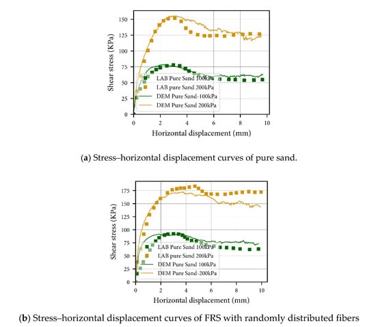 Figure 6 shows comparisons of the shear stress–horizontal displacement curves of unreinforced and reinforced sands at different normal stress levels obtained from DEM simulations and laboratory measurements. It is seen that the predicted DEM responses match well with the laboratory data, thus indicating that the proposed DEM model can capture the shear behavior of FRS. The set of micromechanical parameters selected for DEM simulation in the current analysis is shown in Table 1.