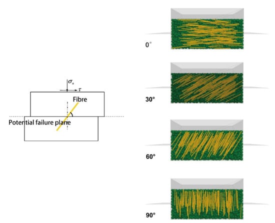 To evaluate the effect of different fiber orientations on the mechanical reinforcement, a series of numerical direct shear tests were performed on FRS using PFC3D. As shown in Figure 7, the angular orientations of fibers in the simulations were set to 0°, 30°, 60°, and 90° against the shearing surface.