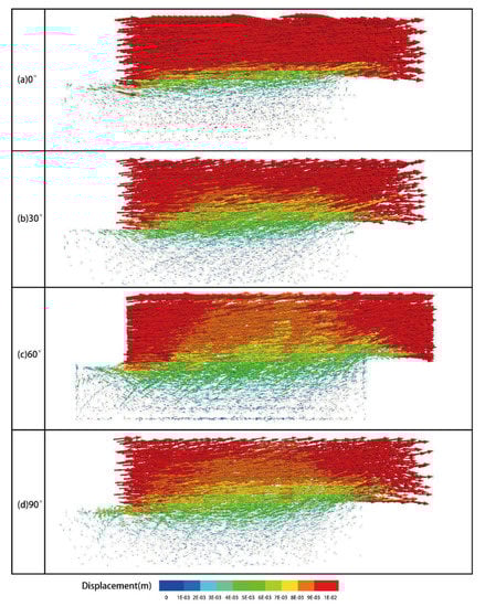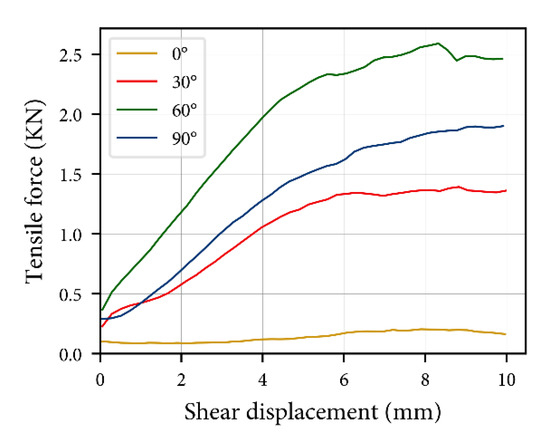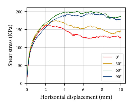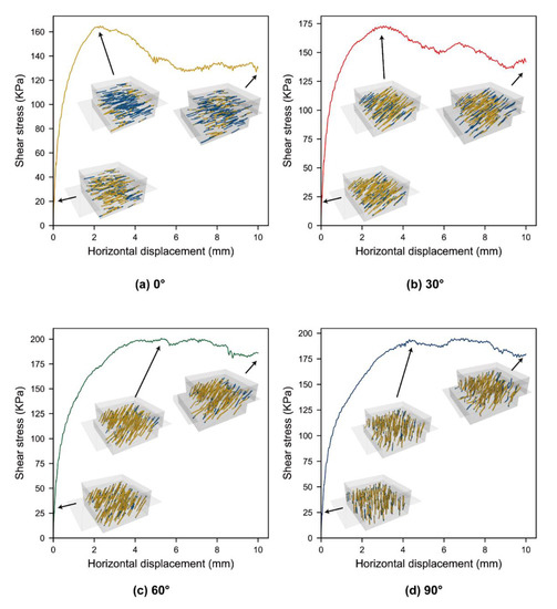 Figure 8 shows the shear stress–horizontal displacement curves obtained for samples with different fiber orientations under the applied normal stresses of 200 kPa in DEM simulations. The shear resistance of FRS was not significantly affected by fiber orientation at small horizontal displacements (less than 2 mm). However, a preferential orientation of fibers induced significant shear strength anisotropy, in particular at large horizontal displacements. The highest shear stress is observed at a fiber orientation angle of 60°, and then gradually decreasing values are observed for fiber orientation angles of 90° and 30°. The specimen with a fiber orientation angle of 0° produced the weakest reinforcement effect. This result is consistent with that of Gray and Ohashi [11], who also found that an angle of 60° produced the greatest strength increase.