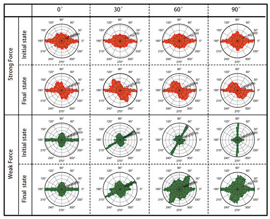 Considering that intergranular forces are strongly dependent on the orientation of contacts, a complete description of load transfer in granular assemblies requires information on the distribution of contact orientations. The morphological characteristics of force chain networks (strong and weak) of FRS with different fiber orientations before and after shearing provide insights into the paths transmitting contact force in FRS. Figure 9 presents polar histograms in the XZ orthogonal view, showing the distribution of contact normals before and after shearing in specimens with different fiber orientations under 200 kPa of normal stress.