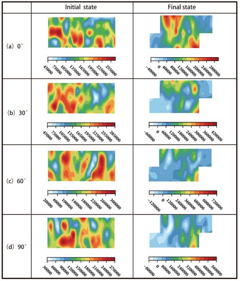 Furthermore, the stress state also influenced the evolution of anisotropy and the force chain network [38]. A representative stress for any sub-region of the granular material can be determined by summing together the stresses in the material cells within the chosen measurement region. We defined the measurement region in the middle section along the y direction of the generated FRS sample. Figure 10 shows the measured major principal stress field in FRS with various fiber orientations under a vertical pressure of 200 kPa. It is noticed that the distribution of principal stress magnitude is very close. In the initial state, a uniform distribution of major principal stress was observed, as shown in Figure 10. In the final state, the major principal stress mainly concentrated in the direction from upper left to lower right. Cui et al. [39] and Wang et al. [40] have shown that the major principal stresses have an angle of 60° relative to the vertical in direct shear tests with the DEM. This confirms the conclusion that the maximum reinforcement can be achieved when the major principal stress direction is perpendicular to the preferred fiber-orientation plane, which is in agreement with the result by Gao et al. [41]. In principle, maximum forces are carried by contacts with orientations close to the direction of maximum principal stress [42]. This conclusion supports the finding that the achieved optimum orientation angle of fibers is perpendicular to the main direction of strong contact force in the direct shear testing.