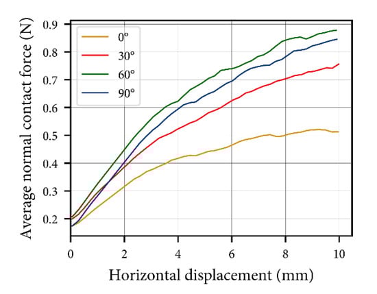 The normal force on the fibers has an important influence on their reinforcing effect. The stresses required to deform the matrix translate into an additional normal force on the matrix–fiber interface, and therefore into additional frictional and pull-out resistance. To understand the mechanism of interface interaction between fibers and sand particles, the effect of fiber orientation on the normal force of sand–fiber contact during direct shear testing is described in Figure 12. This figure makes it apparent that the normal force on the sand–fiber contact with fibers having an orientation of 60° is obviously larger than that with fibers having other orientations, contributing to the largest macro-scale shear strength. This discrepancy could be attributed to the phenomenon that the main direction of strong contact force is perpendicular to the orientation of 60°, which increased the normal force on the sand–fiber interface to the greatest extent.