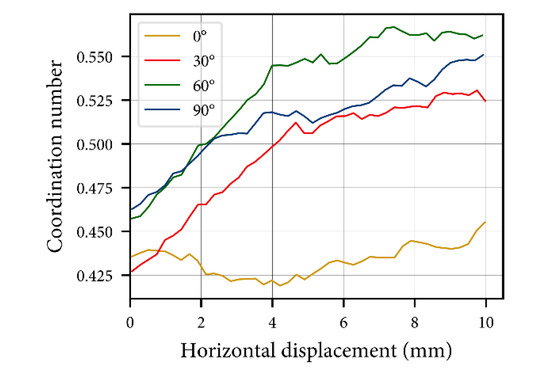 Figure 13 shows the change in sand–fiber CN that accompanies shear loading in FRS with different fiber orientations, which can provide an explanation of differences in the reinforcement effects. The results show that variation of CN for sand–fiber contacts is observed due to fiber orientation. The CN of sand–fiber contacts in the sample with 60° fibers was the highest, with successively lower CNs for 90°, 30°, and lastly 0°. This result indicates that the 60° orientated fibers give rise to the largest effective interfacial contact area of sand and fibers, which explains why the optimum orientation of fiber reinforcement is 60°.