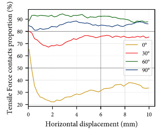 Contribution of fibers to the shear strength is effective when FRS are subjected to tension, although the fibers play no role in compression as they may buckle or kink [44]. Figure 15 shows the spatial distributions of the contact force in fibers for different shear displacements. The figure shows that fibers may be subject to tension (yellow) or pressure (blue) in FRS with different fiber orientations and horizontal displacements. To analyze the difference quantitatively, Figure 16 shows the proportion of numbers of tensile contacts to the total number of contacts in fibers. Obviously, most of the fibers in different samples are subjected to tension at the initial state, although the value is very small. The number of tensile contacts in fibers with fiber orientations of 0° and 30° first decreased and then increased to a stable value. However, the number of tensile contacts in FRS with fiber orientations of 90° and 60° always stayed high during the whole progression. The FRS with fiber orientation of 60° had the highest numbers of tensile contacts, which contributes to the understanding that the fiber initial orientations of 60° mobilized the largest tensile force.