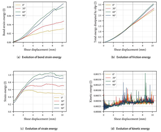 The energy dissipation mechanism provides an important way to explain the micro-mechanical mechanisms in granular materials. To study the effect of fiber orientation on reinforcement, it is necessary to study the evolution of individual energy components in the sand–fiber system under direct shear load. Figure 17 shows the evolution of four energy components, namely bond strain energy, friction energy, strain energy, and kinetic energy during the shear process under normal stress of 200 KPa. Fiber deformation leads to the storage of strain energy in the parallel bonds that join the fiber balls to one another. As shown in Figure 17a, the effect of bond strain energy storage in the fibers gradually appears with the development of direct shear, which also means that the mechanical properties of fibers have been developed gradually. In addition, the bond strain energy stored in fibers having an orientation of 60° is the largest, which means that the mechanical properties of fibers having an orientation of 60° can be mobilized to the greatest extent. Figure 17b indicates that the friction energies increase monotonically with the increase of horizontal displacement. Furthermore, the friction energy dissipation in the sample with fibers having an orientation of 60° is higher than that in samples with other orientations. The stored strain energy in the FRS material increases first and then remains stable during the shearing process (see Figure 17c). The stored strain energy in the sample with fibers having an orientation of 60° is the largest. The enhanced capacity of the assembly to store strain energy could also be a factor in enhancing its shear strength. Because of the low loading rate, the kinetic energy is very small and almost unchanged during the shearing process (see Figure 17d).