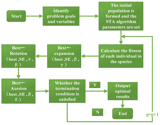 The basic flowchart of the STA is shown in Figure 1. In Figure 1, is the optimal individual in the species, is the number of individuals in the search species, and are the rotation operator, translation operator, expansion operator, and axesion operator, respectively. In Figure 1, three steps of expansion, rotation, and axesion are performed, and the translation operation is embedded in these three steps.