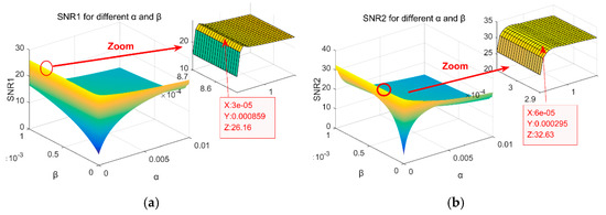 An improved STA was used to optimize and in ACMD, with the SNR as the Z-axis, and C and D as the X- and Y-axes, respectively. The results are shown in Figure 7. The range of the value optimization in this paper is , and the range of value optimization in this paper is . In Figure 7a, . In Figure 7b, and . As there are 106 data in the optimization result, the color display of the graph is not obvious, so this paper extracts 400 data points around the largest data point to enlarge the graph. As shown in Figure 7a,b, the maximum point can be clearly observed in the figure.