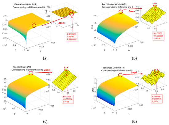 The most suitable and for four kinds of animals ((a). False Killer Whale’s locally enlarge around maximum point of SNR; (b). Baird’s Beaked Whale’s locally enlarge around maximum point of SNR; (c) Weddell Seal’s locally enlarge around maximum point of SNR; (d) Bottlenose Dolphin’s locally enlarge around maximum point of SNR).