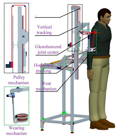 According to the model of the shoulder complex, establishing its kinematic model is equivalent to obtaining the GH joint motion information. The GH joint possesses six DOFs (three rotations and three translations). To completely track the GH joint, a wearable detection mechanism was designed, which possesses three vertical orthogonal translational joints and three rotational joints with axes intersecting vertically in the GH joint center. The detection mechanism includes a horizontal and a vertical tracking mechanism, as shown in Figure 3. The function of the wearable mechanical system is to fully track the motion information of the GH joint in the upper limb accessible workspace.