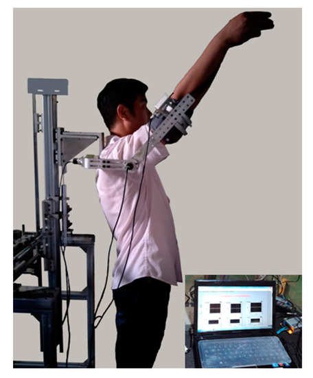 Combining the data measurement system, the rotation information of the GH joint can be obtained through the connection between the encoder, coupling, and detection mechanism. The translation information of the GH joint can be acquired through the connection between the displacement sensor and the detection mechanism. The data curve in the acquisition process is displayed on the human–robot interface in real time. The wearable detection system integration is shown in Figure 5.