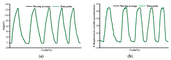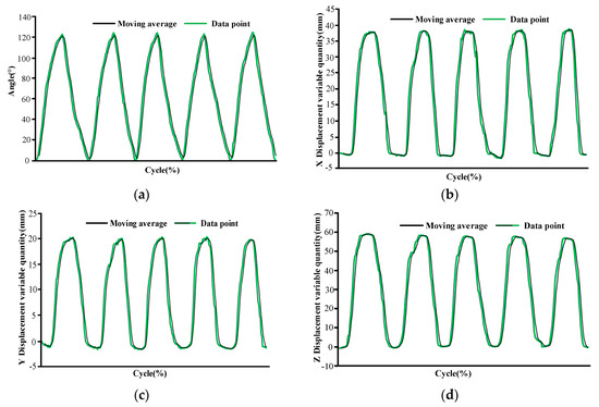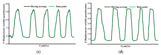 During the experiments, the movements of the humeral raising and lowering in the sagittal plane and the GH joint center displacement variable relative to the thorax coordinate system in the X-, Y- and Z-directions were observed, which are presented in Figure 6a–d respectively, where the abscissas represent the degree of completion of the five cycles. During the raising and lowering movement of the humerus, the GH joint center displacement variable was large and regular in the X-, Y- and Z-directions, confirming the coupled motion relationship between the GH joint center displacement variable quantity and humeral elevation angle in the sagittal plane. Then, many tests were completed under the same conditions, and the results were consistent.