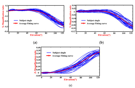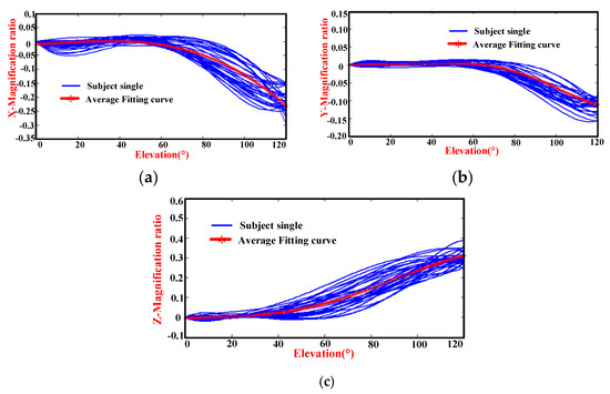 The changes in the Z-direction are shown in Figure 13c. The humeral elevation in the coronal plane, the magnification ratio, and the elevation angle are positively correlated during humeral elevation from 0° to 120°, except for a weak correlation in the initial and last stages. In the sagittal plane, the magnification ratio is also the same as that in the coronal plane of humeral elevation.