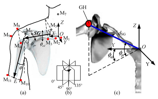 Klopčar used the method of markers (M1–M11) pasted onto the skin of the right shoulder complex, as shown in Figure 10. The angular displacement data corresponding to the joints of the shoulder complex when the upper arm is elevated in the 0°, 45°, 90°, and 135° planes were obtained. The measurements were combined to cover the entire reachable domain of the humerus in the above-defined planes [8]. Through the analysis and integration of the data measured in the experiment, the coupling relationship between the movements of the shoulder girdle and humeral elevation angle was obtained. Therefore, the angle ϕed of elevation/depression and the ϕpr of protraction/retraction were calculated according to Equations (4) and (5) during humeral elevation, respectively.