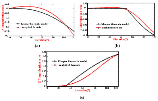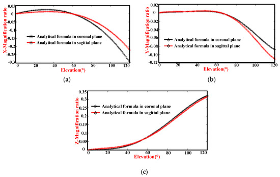 The changes in the X-direction are shown in Figure 13a. During humeral elevation in the coronal plane, the slope of the curve is relatively small in the initial stage, and then increases. When humeral elevation is in the sagittal plane, the slope is small in the initial stage, and then the slope decreases. They intersect in the middle. After that, they basically follow the same slope. Although the movement trends are also the same, the magnitude of the motion is different. The difference in the magnification ratio is 0.074 at the 120° elevation angle.