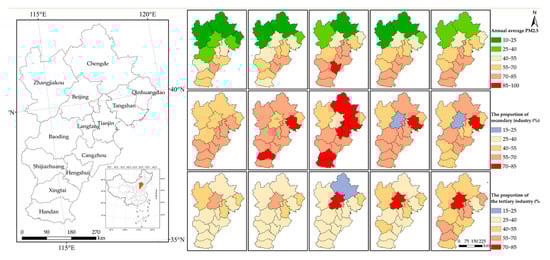 Figure 1 shows the air quality and industrial development of the Beijing-Tianjin-Hebei region during the study period. There are obvious spatial differences in the industrial structure of the Beijing-Tianjin-Hebei region. The cities transformation to the "tertiary industry-secondary industry-primary industry" type and the "secondary industry-tertiary industry-primary industry" type is also a manifestation of advanced industrial structure. Industrial structure adjustment is an effective means to promote pollution reduction, but due to the previous air pollution prevention and control policy, it is difficult to clarify the task requirements of industrial structure optimization and adjustment, especially the pollution reduction goals that the work in this field needs to strive to achieve, leading to inter-regional industrial structure adjustment. The intensity varies greatly, and the effects of pollution reduction have not been fully exerted. Based on the need to improve the quality of the atmospheric environment and reduce the intensity of pollutant emissions per unit of output, the industrial structure adjustment strategy has been studied, and the task requirements and suggestions for industrial structure adjustment are put forward to achieve sustainable development.