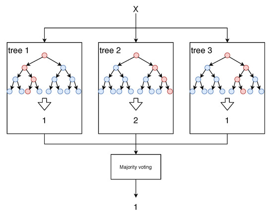 The Random Forest (RF) [30] is a combination of decision trees that use random subsets of the features to be built. Figure 1 shows an example of RF.