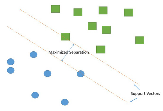 Support Vector Machines (SVM) [31] are supervised learning models that look for optimal hyperplanes that separates classes. An optimal hyperplane is defined as the linear decision function with maximal margin between the vectors of the two classes (Figure 2).