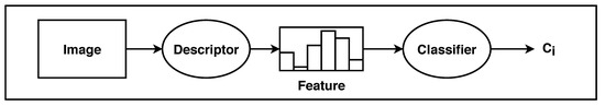 The first step in the pipeline is to classify a picture into the C different classes. Given a descriptor and a classifier, the classifier is trained with features obtained from the description of the set of images for training. Given a new image to be classified, the descriptor extracts the feature from the image and that feature is classified by the classifier (Figure 3).