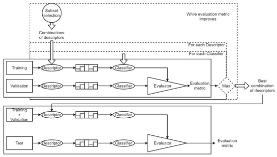 The dataset is divided in two sets: training and test. During the search of the best combination of descriptors, training set is used for training the classifiers and validate the feature selection technique. This separation is made by a Leave-One-Out Cross-Validation (LOOCV) [38]. Each image of the set is used as validation while the rest of the set is used to train the model. Figure 4 shows the whole process. Given a descriptor and a classifier, both are tested using the LOOCV to set the training and validation sets. Once the best combination of descriptors is found, to test the quality of this combination, we use the test set to obtain a general evaluation metric.