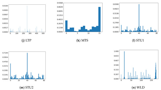 Histogram of all the used descriptors applied to a sample image. The vertical axis represents the number of occurrences of each texture unit normalized and the horizontal axis represents each of the texture units of the histograms. The descriptors are the ones that are part of D described at the beginning of Section 4.