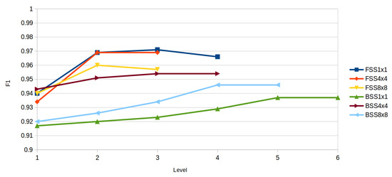 Comparative of highest F1 of each iteration of the Subset Selection techniques. FSS stands for Forward Subset Selection and BSS stands for Backward Subset Selection. The numbers after each selection technique stand for the number of windows the descriptor has been applied to.