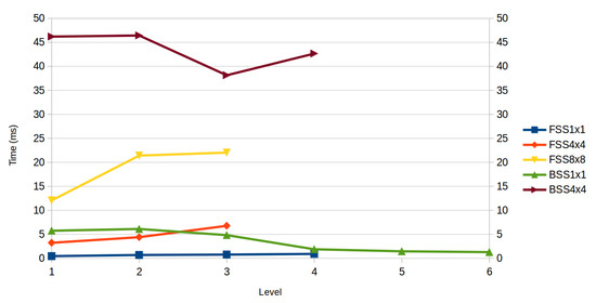 In terms of speed, Figure 8 shows a comparative of the test time for each of the methods. The time shown is the average of the different descriptors and classification techniques for testing one image. FSS, FSS, and BSS have a low computation time, and BSS version performs much slower than the rest of versions due to the high dimensionallity of the data.