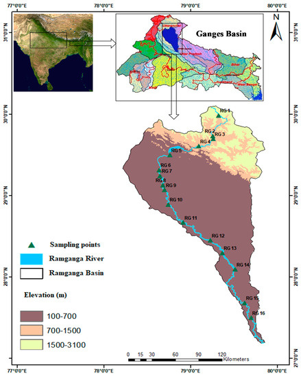Ramganga River flows through the Himalayas (Kumaon region) in Uttarakhand and the GFP before joining the Ganges River in Uttar Pradesh. The river has a catchment area of approximately 22,685 km2, with a total stretch of 642 km from its origin (Dudhotali Mountain of the district Chamoli) to the confluence with the Ganges River [39,40,41,42]. The Ramganga River catchment lies between 30°06′02.22″ N to 27°10′42.11″ N and 79°16′59.22″ E to 79°50′16″ E, with a mean elevation of 1530 m above mean sea level. After covering the first 158 km of its stretch in the Kumaon Himalayas and going through the Jim Corbett National Park, the river enters the GFP at Kalagarh town, where the Ramganga Dam has been constructed. In the GFP, the river flows through the hugely populated and highly agricultural and industrialized districts of the Uttar Pradesh, such as Moradabad, Bijnor, Bareilly, Rampur, Hardoi, Shahjahanpur, and Farrukhabad [43].