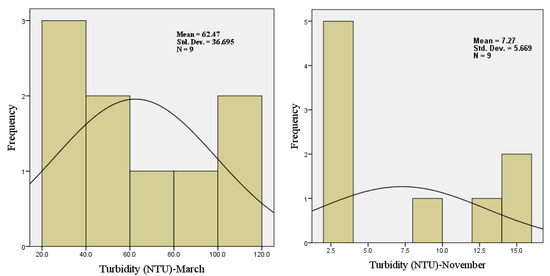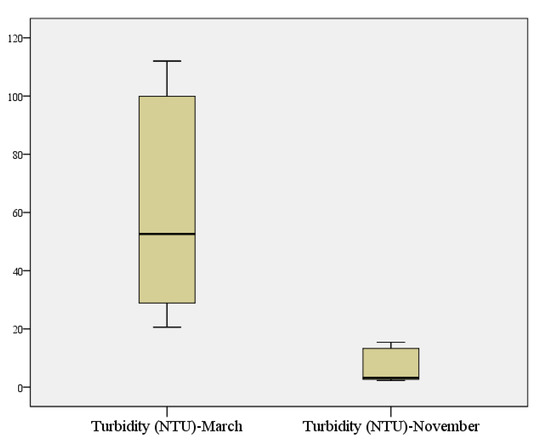 Insitu concentrations of turbidity were measured in both March and November 2014. The distribution of data of turbidity was generally skewed, with low values and without any outliers or very high values (Table 3). Turbidity concentrations ranged between 20.6 and 112.0 NTU with a mean value of 62.467 NTU during March 2014, and between 2.3 and 15.4 NTU with mean value of 7.267 NTU during November 2014.