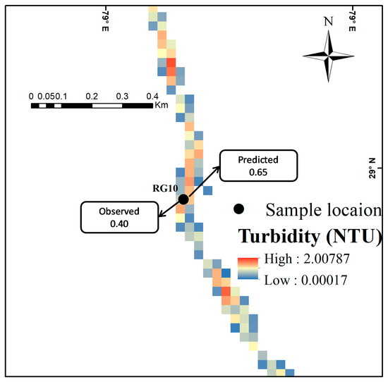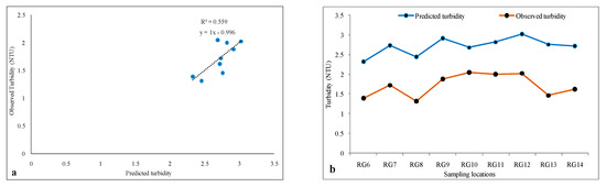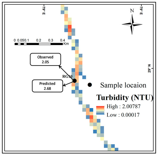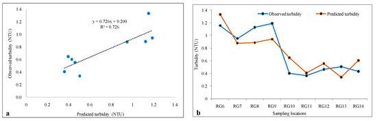 Comparisons between the measured and predicted turbidity for the nine samples that were used to determine the turbidity model are shown in Figure 6 and Figure 7 and Table S3, along with squared residual and root mean square error (RMSE). Moderate correlation factors(R2) of 0.56 and 0.726, with RMSE 1.013 and 0.178, wereobtained for March and November, respectively. For March, the predicted turbidity ranged from 2.329 to 3.023 NTU in relation to the measured turbidity, which ranged from 1.31 to 2.049 NTU (Figure 6). For November, the predicted turbidity varied from 0.337 to 1.33 NTU, compared with 0.362 to 1.18 NTU for the measured values (Figure 7).
