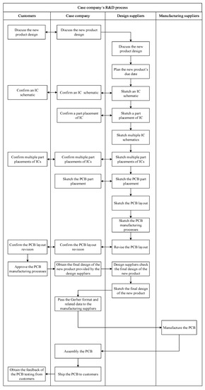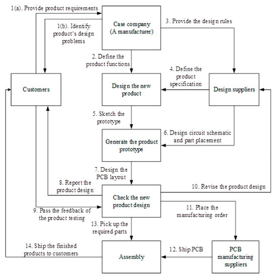New product development (NPD) is a highly interactive and cooperative process requiring additional attention from not only the R&D department of the enterprise [3,4,5,6,7], but also downstream printed circuit board (PCB) design firms and manufacturers [8,9,10]. If a customer requests an even shorter complete NPD and manufacturing time, it requires collaboration among the customers and the participating firms at every step. Ganotakis et al. [11] stated that the so-called product R&D is a collaboration among the internal units of the enterprise and the external partners to achieve the best efficiency, the shortest delivery time, and the lowest cost. It is a must for an enterprise to construct a complete R&D process for integrating the design chain processes of its internal departments and external companies [12,13].