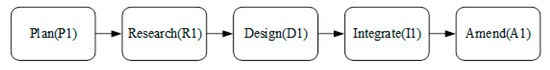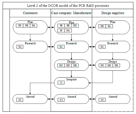 Level 1 of the DCOR model has five steps: plan, research, design, integrate, and amend. When building Level 1 of the DCOR model, it must verify the participating members in the design chain. During PCB R&D processes, the integrating and assembling manufacturer (the case company) plays the role of a medium connecting the customer to downstream design companies and fabrication suppliers; therefore, the major members of this design chain are customers, manufacturers, design suppliers, and fabrication suppliers. However, as fabrication suppliers follow a Gerber format to make the bare PCB, which has little influence on the R&D process, fabrication suppliers are not included in the design chain process and do not play an active role in this research. Therefore, the primary members studied in the design chain in this research are customers, manufacturers, and design suppliers. After verifying the members of the design chain for this study, the next step is to build up Level 1 of the DCOR model of the PCB R&D processes, as shown in Figure 2.