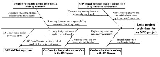 The case company presents the problems by plotting a cause-and-effect chart (Figure 7) and gathers engineers from all the R&D and design departments to brainstorm on improving the R&D process as well as integrate the factors of the aforementioned cause-and-effect chart for the problems of the lengthy R&D process.