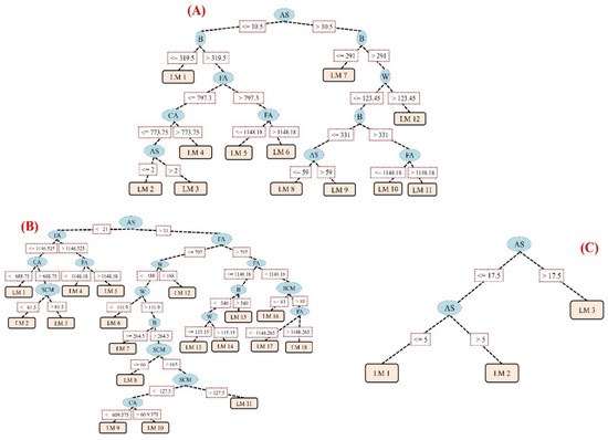 Tree diagram of the proposed M5p model; (A) CS, (B) TS, (C) FS.