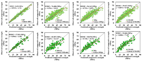 The validation indicator and the related performance of CS, TS, and FS prediction obtained by the various models are presented in Table 6. According to this table, the RF models for CS, TS, and FS, which yielded Rm = 0.691, Rm = 0.834, and Rm = 0716, respectively, satisfy the conditions and provide the best validation compared to the other models. In addition, the CART and M5tree values for CS (Rm = 0.187), TS (Rm = 0.195), and FS were less than the required value for Rm (Rm > 0.5). Thus, it is seen that RF shows highest validity for predicting the mechanical characteristics of RCCP.