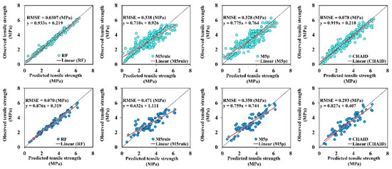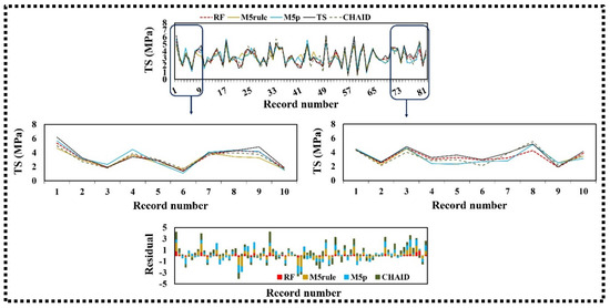 The performance indicators of the calibration and validation capability of estimating the tensile strength of RCCP using tree-based methods are reported in Table 4. According to Table 4, the RF model presented reliable performance in the training and testing phases. The statistical assessment for the validation subset of the proposed RF, M5rule, M5p, and CHAID techniques are (R = 0.984, NSE = 0.955 MPa, RMSE = 0.070 MPa and RSD = 0.062 MPa), (R = 0.850, NSE = 0.706 MPa, RMSE = 0.471 MPa and RSD = 0.500 MPa), (R = 0.882, NSE = 0.776 MPa, RMSE = 0.358 MPa and RSD = 0.328 MPa), and (R = 0.912, NSE = 0.817 MPa, RMSE = 0.293 MPa and RSD = 0.255 MPa), respectively. The graphical plots of subsets of the presented models are scattered in Figure 6. The presented tree-based models achieved acceptable simulation results for the TS of RCCP based on data correlated around the ideal line (1:1 line). Although a few data points developed by M5p and M5rule around the TS of 2–5 MPa indicated some small divergence from the 1:1 line, the results revealed that all of the tree-based methods provided high accuracy to simulate of tensile strength. The time series and residual plots for tree-based simulation and actual TS are presented in Figure 7. The RF model generated the minimum RMSE and outperforms the M5rule, M5p, and CHAID models for estimation of the TS of RCCP.