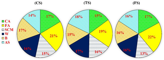 The optimal combination of mixture proportions is calculated using Equation (11) using the PCA technique, as presented in Table 1. Five predictors provided the majority of the explained variance. Table 1 presents the values of the PCs and their variances. In Table 1, it can be seen that the volumetric and weighted forms of the experimental variables of CA, FA, SCM, W, and B, based on PC1, are the most effective independent predictor variables. Therefore, this combination of simulation variables along with age of specimens (AS) is used to construct the models to predict the mechanical characteristics of the concrete. The descriptive measures of the best combination of inputs for simulation of the mechanical characteristics of RCCP are presented in Table 2. The correlation coefficients of the selected independent variables for development of the proposed models are presented in Figure 2. According to the matrix, there are no significant relationships between the developed matrixes of CS, TS, and FS.
